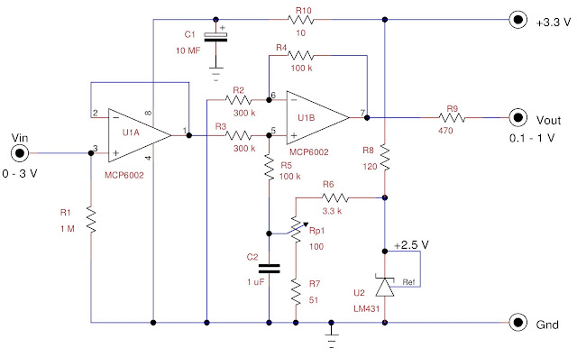prototype. The operational amplifier U1A serves as a voltage follower, U1B as